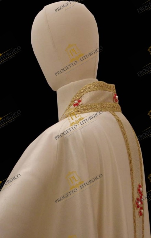 Foderata con tessuto di raso color oro, la casula bianca gotica che presentiamo qui è realizzata in morbida seta shantung e tessuto di lana papale dorata.