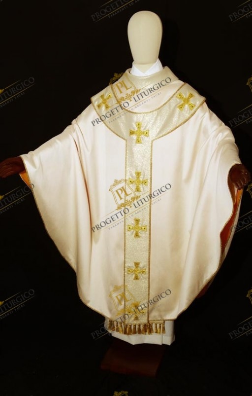 La casula bianca con pallio che vediamo nelle foto è ispirata nella foggia e nel decoro ad opere del passato. Il modello della casula bianca con pallio, infatti, è quello tipico paleocristiano, a "campana", reso più attuale dal collo tondo.