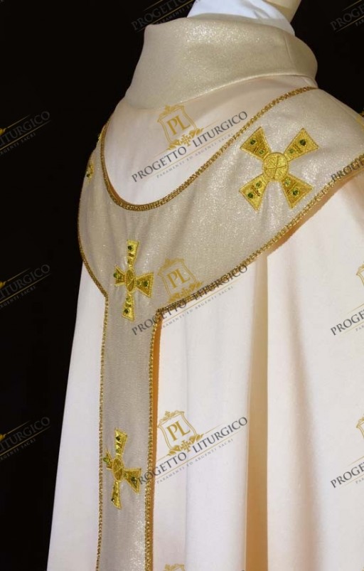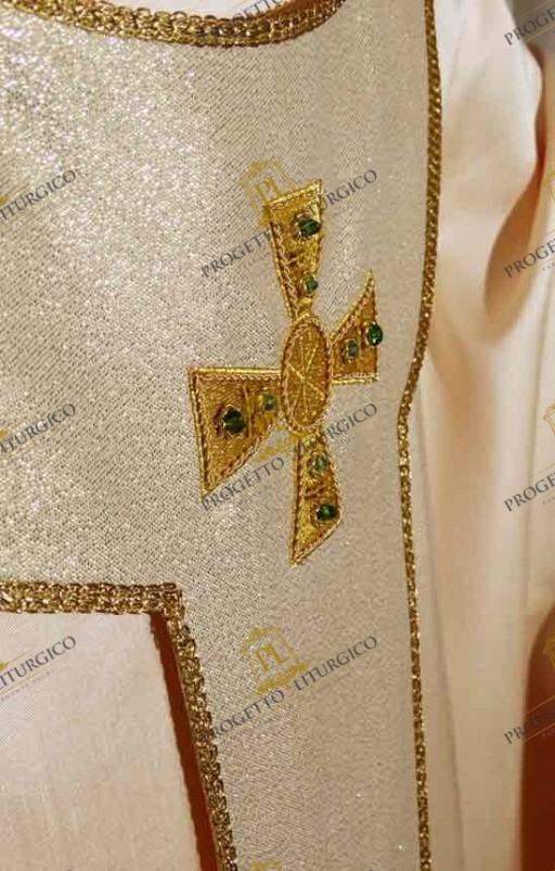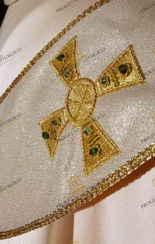 E' il pallio sacerdotale il vero protagonista di questa casula bianca con pallio. Esso, infatti, presenta sul davanti e sul dietro sette croci ricamate con filato dorato, il cui disegno è ispirato ad antiche stole sacerdotali. Ciascuna croce ricamata è impreziosita da pietre azzurre e verdi, messe in risalto dalla canutiglia applicata a mano. Piccole e delicate paillettes completano la decorazione di queste preziose croci.
