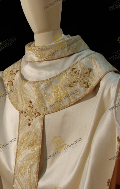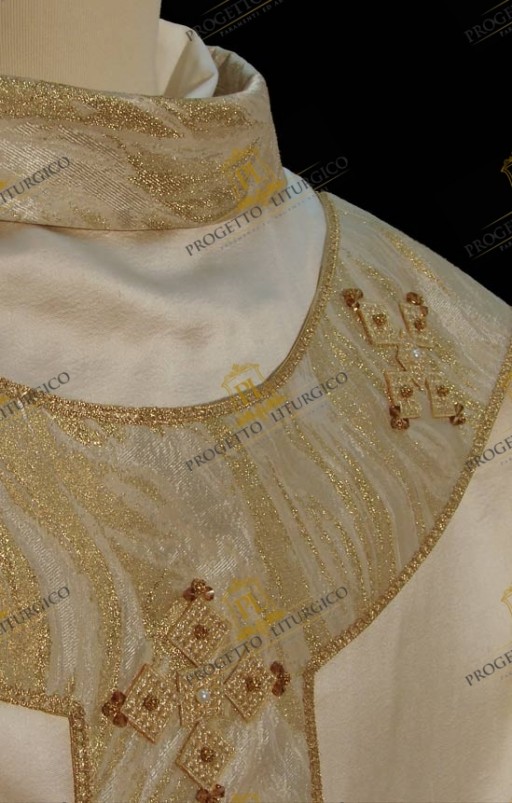 Disegnata e realizzata per una ordinazione sacerdotale, questa preziosa casula bianca paleocristiana è realizzata in morbida seta shantung e foderata in leggero tessuto di raso dorato. Il collo e il pallio sono realizzati con un particolare tessuto broccato dal disegno fiammato, che dona luminosità alla casula.