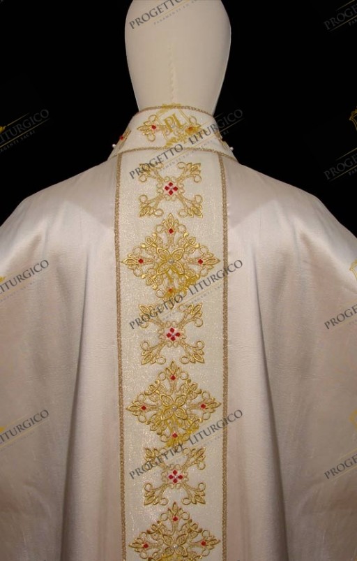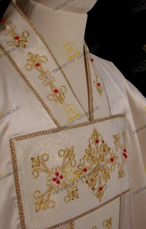 Realizzata in preziosa seta shantung e foderata con leggero tessuto di raso di colore rosso, questa casula bianca gotica è decorata con un ricco ricamo dorato. Tale ricamo costituisce il tau sul davanti e lo stolone sul dietro, ed è impreziosito da giochi di cristalli rossi e perle.