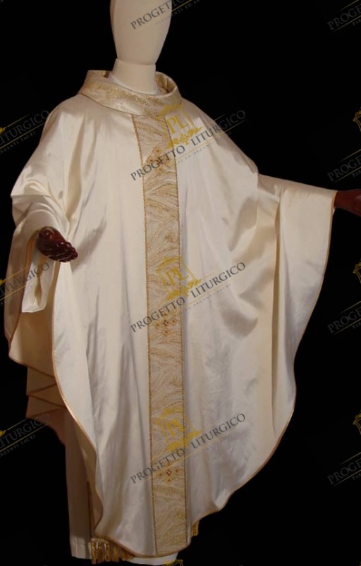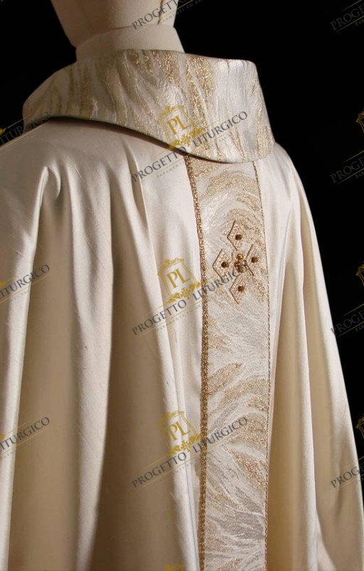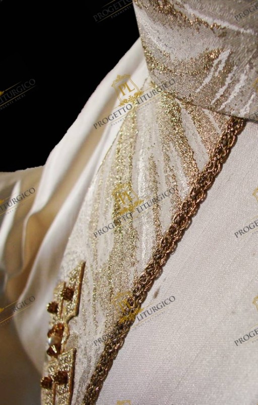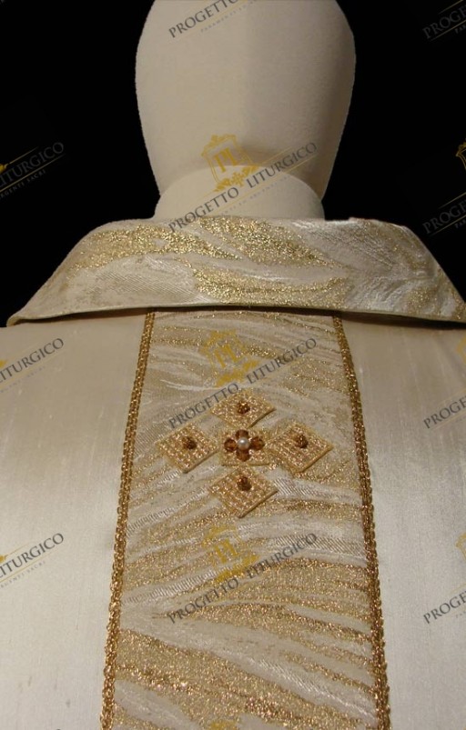 La decorazione della casula bianca è costituita, sul davanti e sul dietro, da stoloni in tessuto broccato a fiamme dorate su cui trovano posto delle croci ricamate in filato color oro bianco. La stessa decorazione è presente alle estremità della stola, terminante con fiocchi dorati.