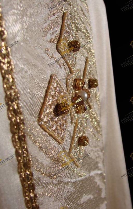 Ogni croce presente sulla casula bianca è impreziosita da un gioco di cristalli color topazio, perle e pietre incastonate per donare al capo luminosità e pregevolezza.