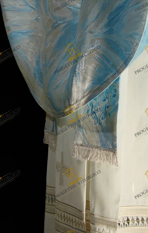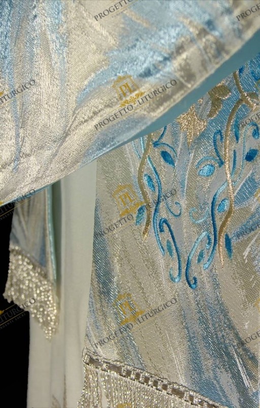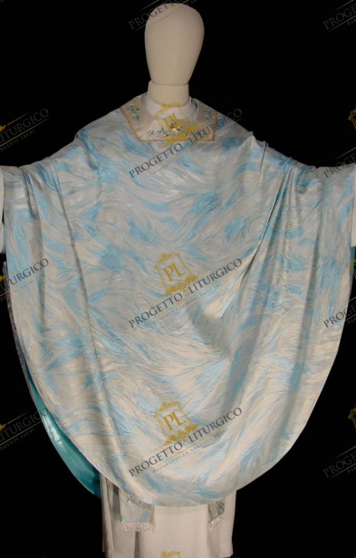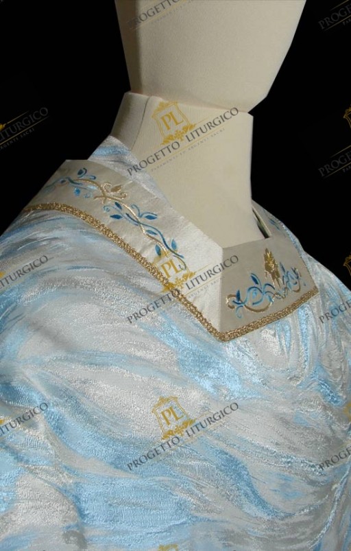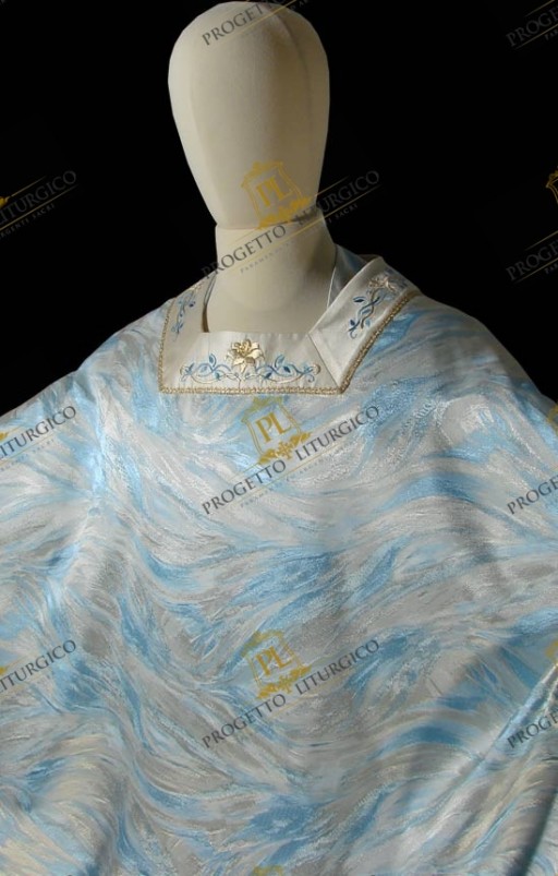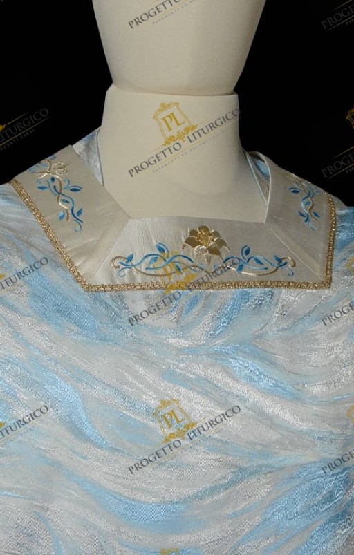 Di foggia paleocristiana, la casula mariana qui presentata è realizzata in un particolare tessuto broccato dal disegno ondulato che varia dalla tonalità dell'avorio a quelle azzurre e celesti. lo scollo quadrato della casula mariana è realizzato in seta shantung ed è ricamato con motivi floreali, tra cui emerge il giglio, simbolo di purezza da sempre utilizzato per indicare Maria Vergine.