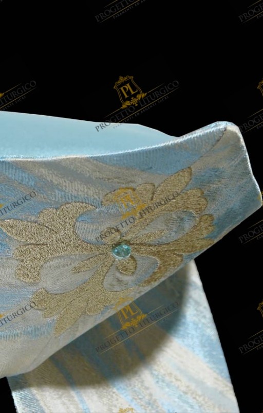La stola della casula mariana è realizzata nello stesso tessuto broccato, foderata con raso celeste e ricamata sul fondo con gli stessi motivi floreali presenti sullo scollo del paramento. Al centro di questi ricami vi sono dei giglio al centro dei quali sono cucite a mano dei cristalli celesti. Una frangia in canuttiglia argento completa la stola.