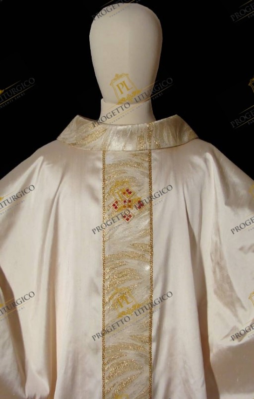 Realizzata in una pregiata seta shantung, questa casula bianca risulta molto semplice ma elegante e raffinata nello stesso tempo. Il collo tondo e la decorazione tutta sono realizzati in un particolare tessuto broccato dorato, che dona luminosità alla casula bianca.