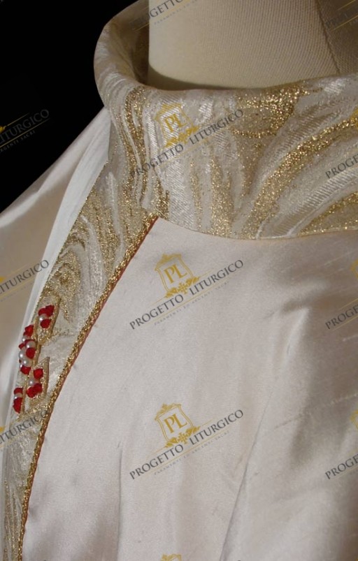 La decorazione della casula bianca è costituita dagli stoloni del davanti e del dietro, rifinitI da un raffinato agremano dorato dal motivo ondulato, a riprendere le onde del tessuto stesso. Solo sul davanti vi è una croce ricamata e resa preziosa da un gioco di perle e cristalli rossi.