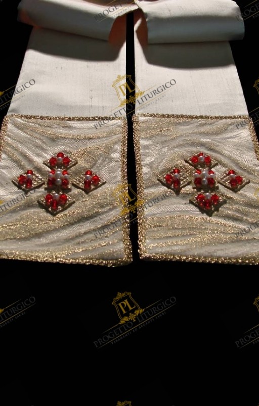 La stola sacerdotale coordinata alla casula bianca riprende, nella parte finale dei suoi lembi, la stessa croce rendendo, così, la stola dignitosa e bella.