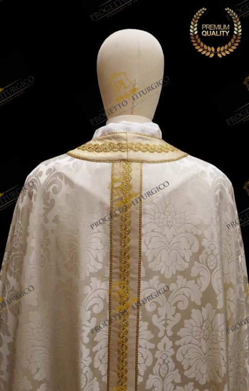 La casula paleocristiana avorio realizzata in tessuto broccato è un paramento di notevole eleganza.
