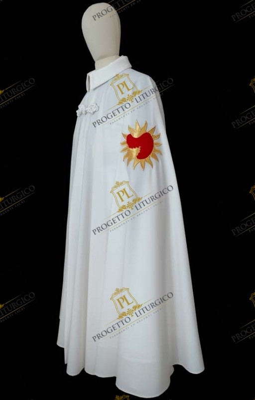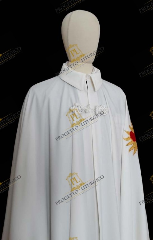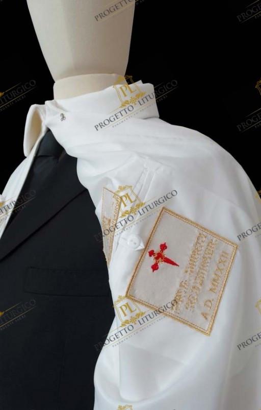 Il mantello per cavaliere dell'ordine reale di san Michele dell'ala è realizzato interamente in tessuto frescolana 100% di colore bianco e reca all'altezza del braccio sinistro l'ala di san Michele con il sole ricamati direttamente sul tessuto.