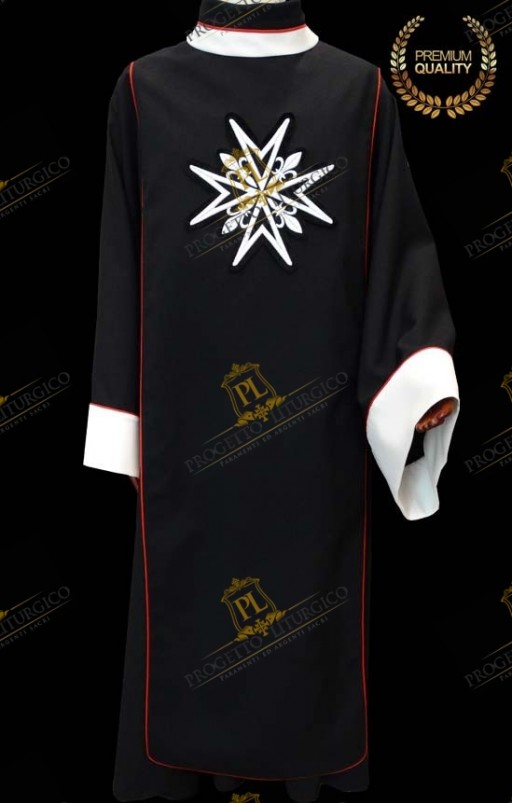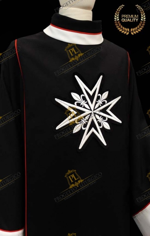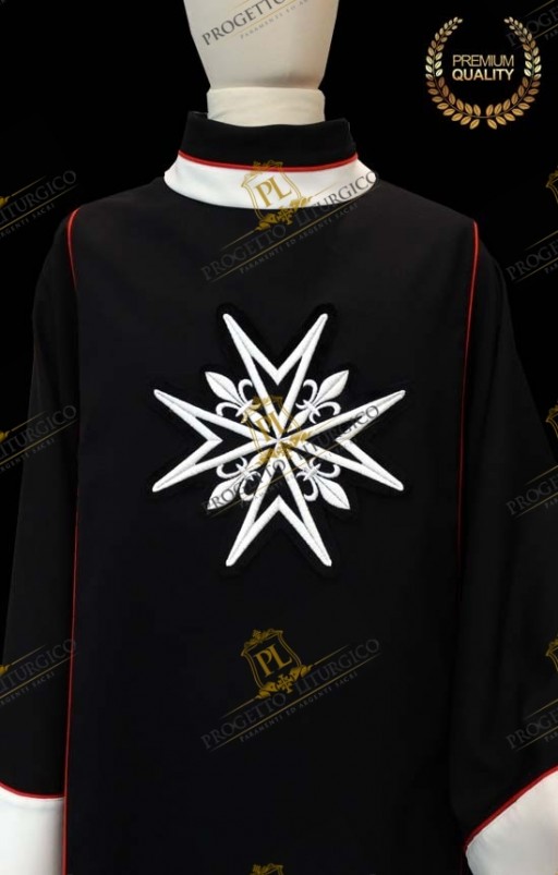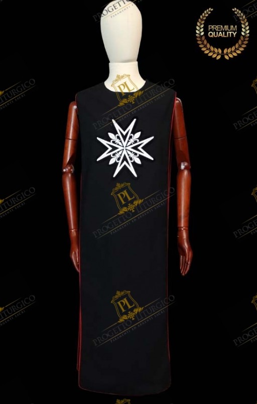 Lo scapolare è fornito di zip sulla spalla per agevolare il suo impiego. Tutto il profilo dello scapolare per Cavaliere di Grazia e Devozione in Obbedienza Malta è impreziosito con bordo rosso, e sul petto è collocata la croce dell'Ordine di Malta ricamata in filato bianco.