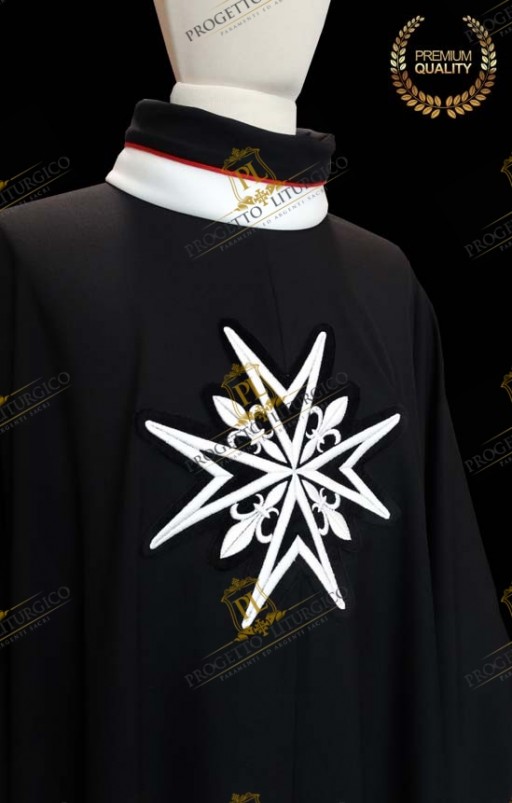 La cocolla Onore e Devozione Malta è confezionata in maniera sartoriale usando un tessuto in fresco lana nera, leggera e confortevole anche con i climi più caldi.